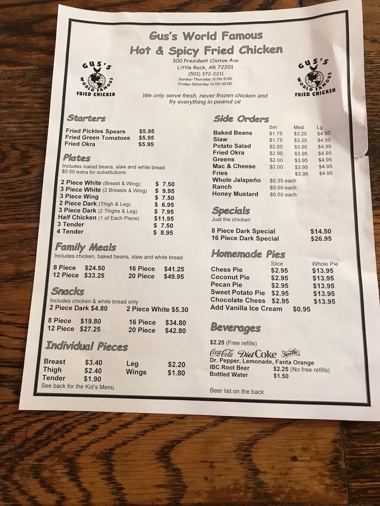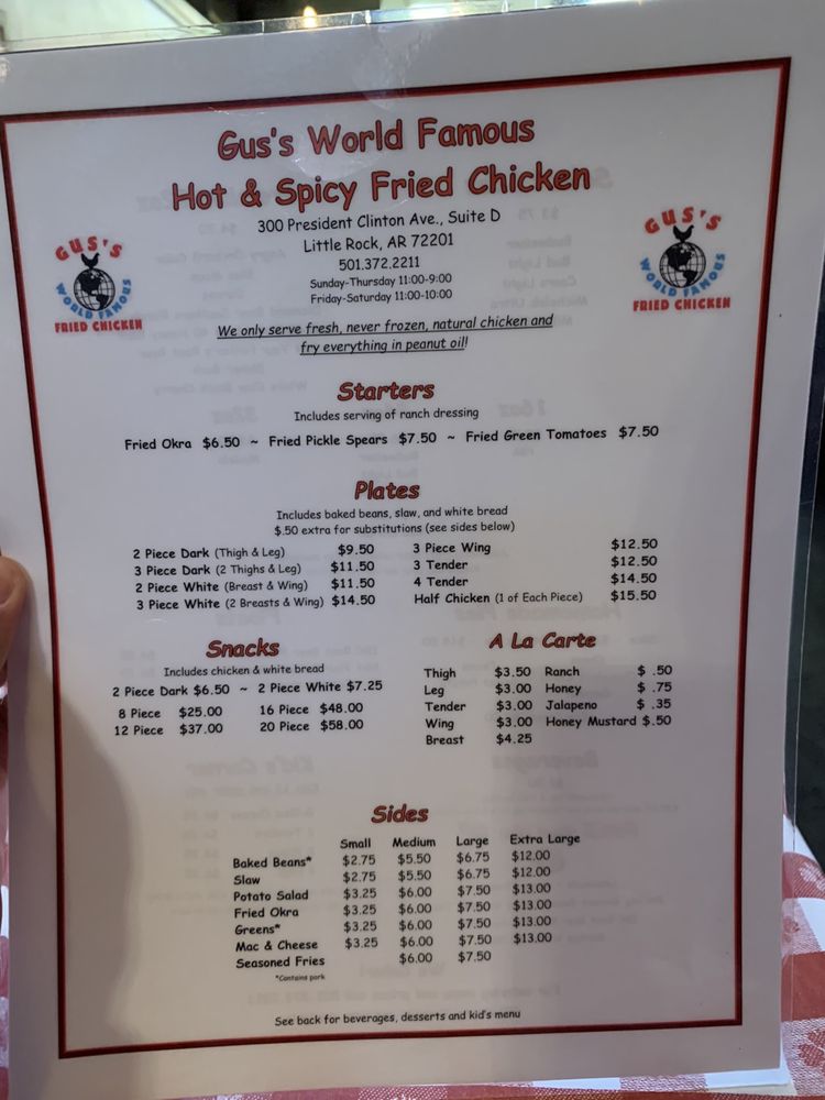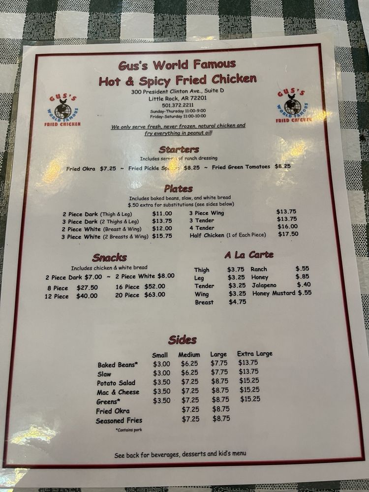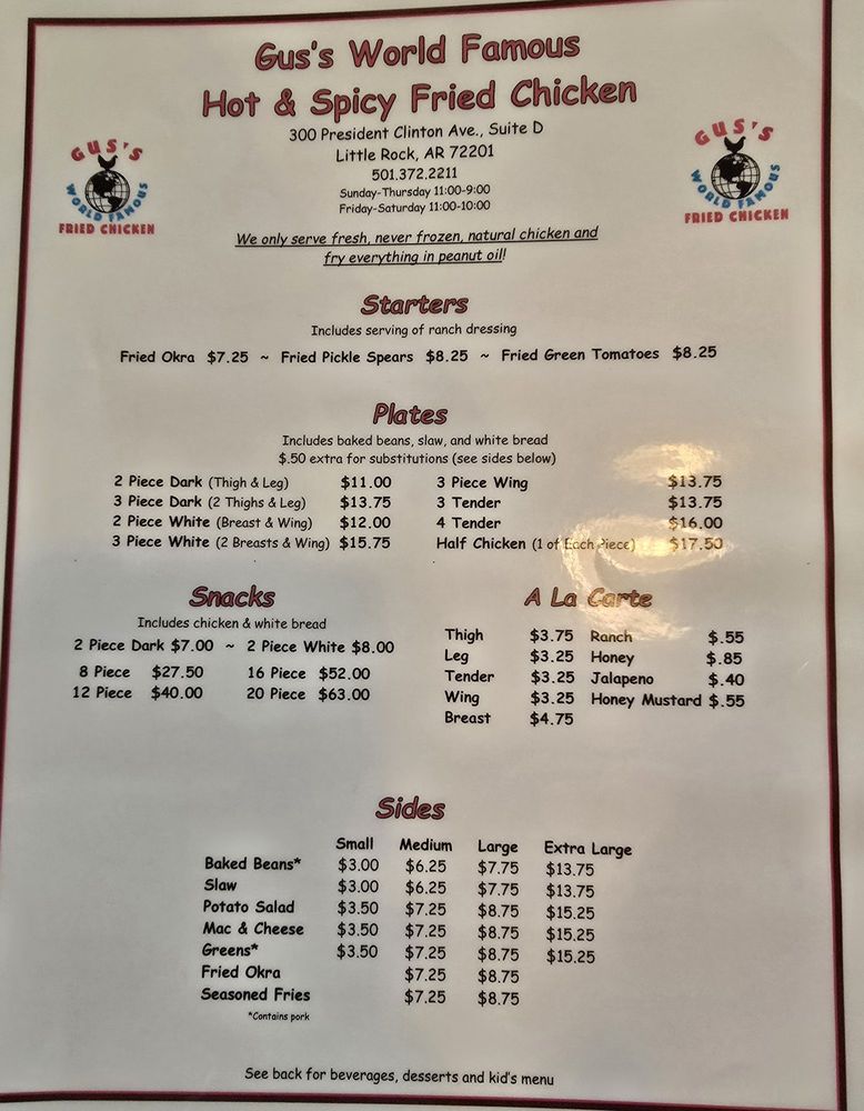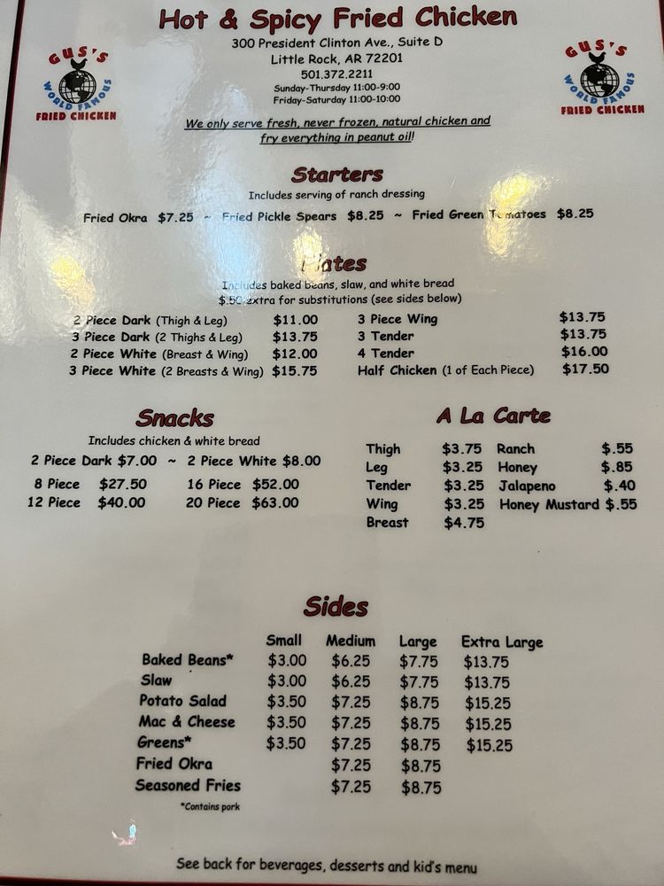 Welcome to Gus's World Famous Fried Chicken in Little Rock, where flavor and hospitality meet! Nestled at 300 President Clinton Ave, this iconic eatery beckons with a menu crafted for both comfort and excitement. Their standout offering, the Chicken Sandwich, features a juicy thigh, tangy pickles, and creamy mayo—sure to make taste buds sing. For a fuller experience, try the 2 Piece White Plate, showcasing hand-battered chicken, savory baked beans, and creamy coleslaw, all perfectly cooked in peanut oil.